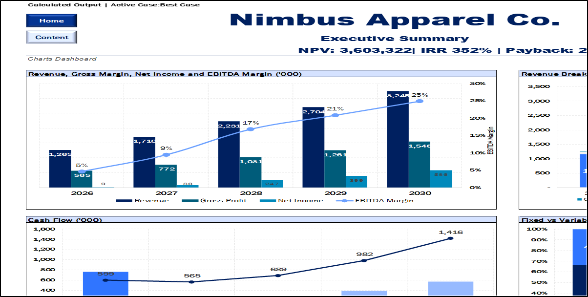 Visual Analytics: Pre-built charts for Revenue Breakdown, Cash Flow trends, and Margin analysis.