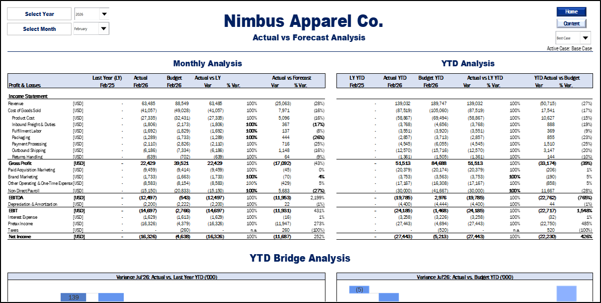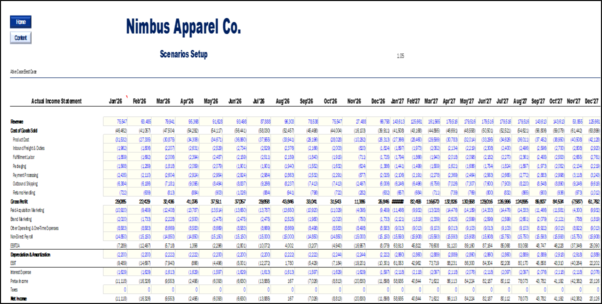 Scenario Planning (Base, Best, Worst): Instantly toggle between different business outcomes. Test the impact of changing marketing efficiency (CAC), product margins, or shipping costs on your bottom line.