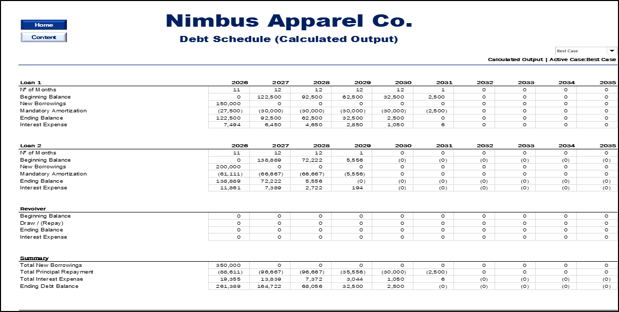 Calculations Engine: Deep-dive sheets for Revenue, Personnel, Debt, and Working Capital.
