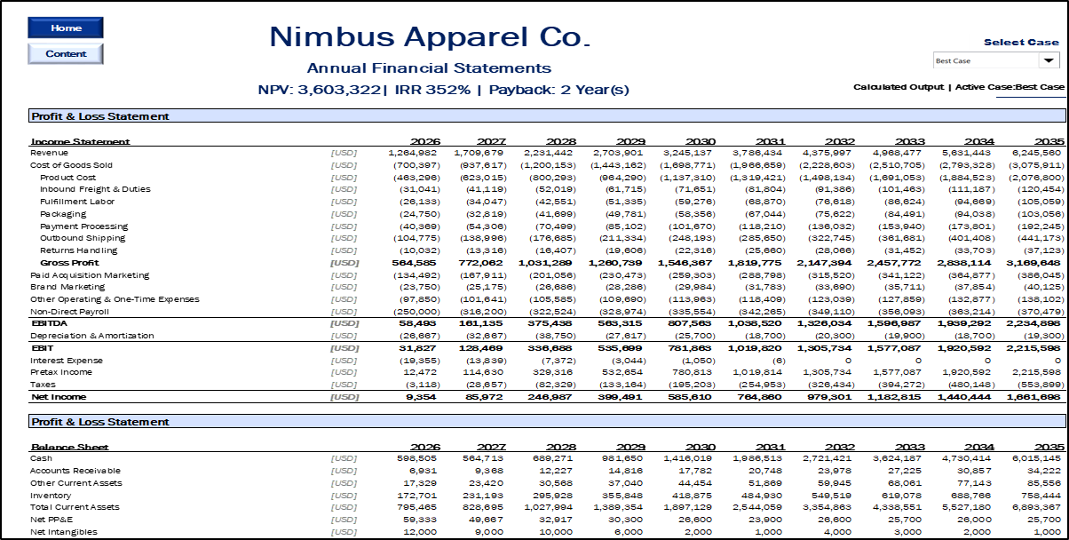 Input Module: A centralized hub for all assumptions (Pricing, COGS, Marketing, Opex).