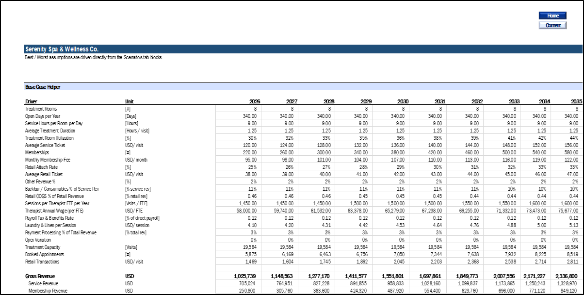 Detailed Service & Retail Mix:Model revenue across multiple categories (e.g., massages, facials, hydrotherapy, med-spa services) alongside high-margin retail product sales and recurring monthly membership tiers.